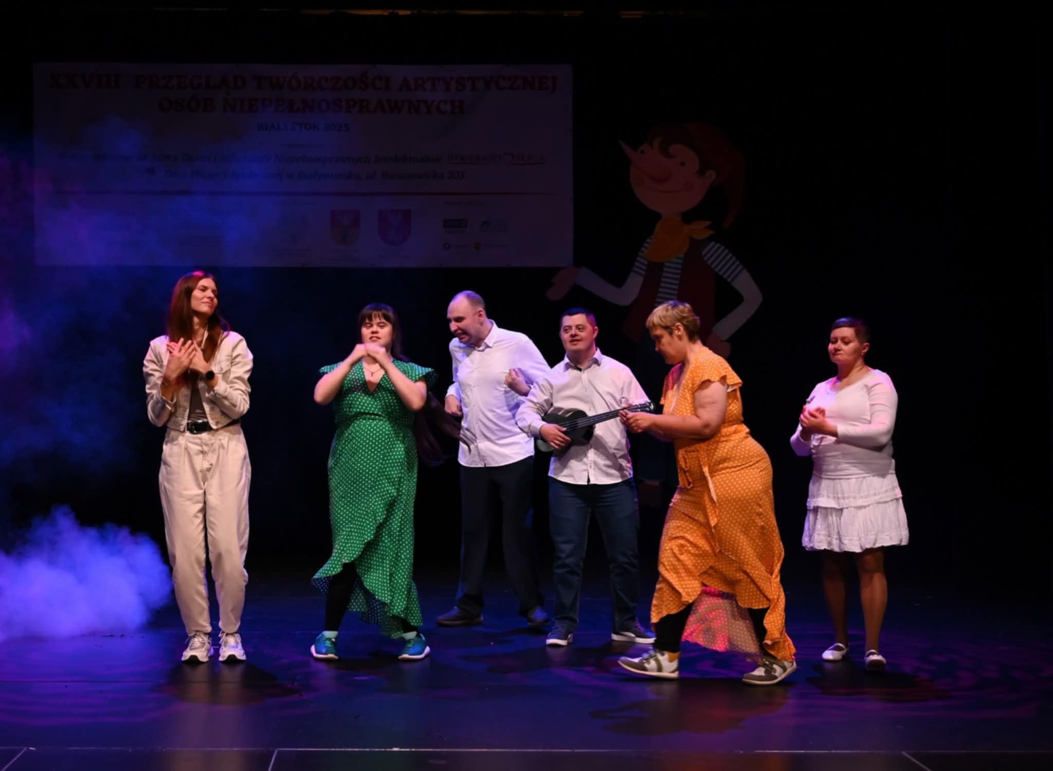 W poniedziałek 6.10.2025r. uczestniczyliśmy w XXVIII Przeglądzie Twórczości Artystycznej Osób Niepełnosprawnych w Białostockim Teatrze Lalek. Uczestnicy naszych Warsztatów zaprezentowali na scenie pokaz taneczny – zatańczyli do piosenki Kramera ,,Ja nie wyglądam na Jamesa Bonda” oraz do piosenki Mirage ,,Wiosna”. Wydarzenie to miało charakter kulturalny, ale było także okazją do integracji z uczestnikami z innych placówek.